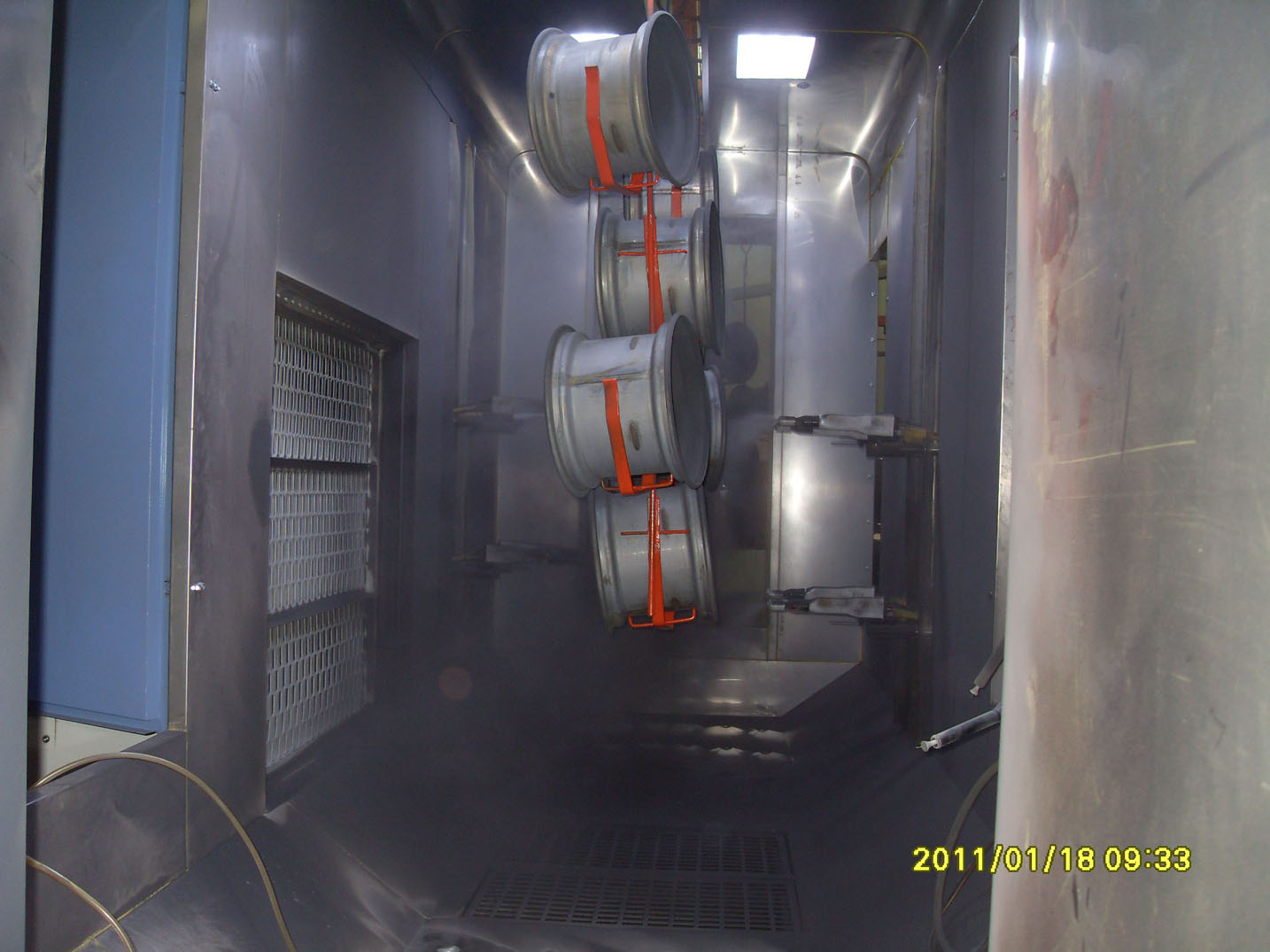 钢制轮毂粉末涂装生产线由人工上下工件区、工件输送线、前处理系统、脱水炉、喷粉室、上下往复机系统、供粉系统、固化炉、加热系统、冷却系统组成。