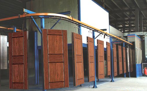 木门喷涂设备由人工上下工件区、工件输送线、除尘系统、预热系统、喷漆室、上下往复机系统、工件旋转系统、供漆系统、洁净鲜风供给系统、废气排放系统、烘干炉、加热系统、冷却系统组成。