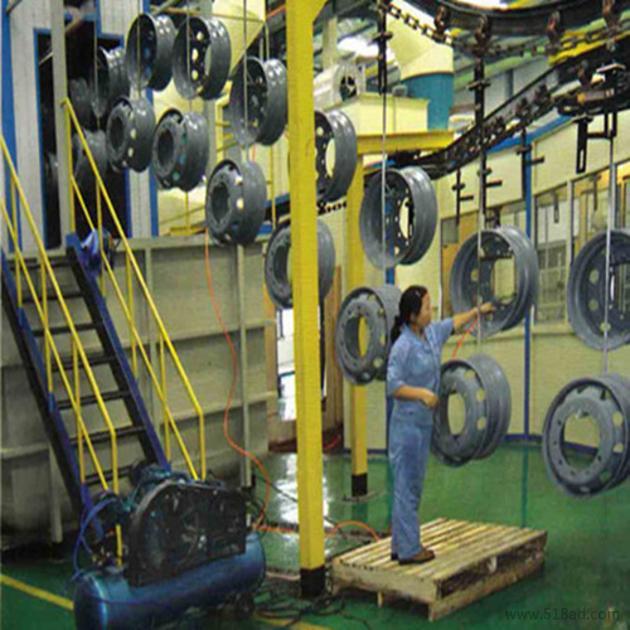 汽车钢圈涂装线由人工上下工件区、工件输送线、除尘系统、预热系统、喷漆室、自动机器人、供漆系统、洁净鲜风供给系统、废气排放系统、烘干炉、加热系统、冷却系统组成。