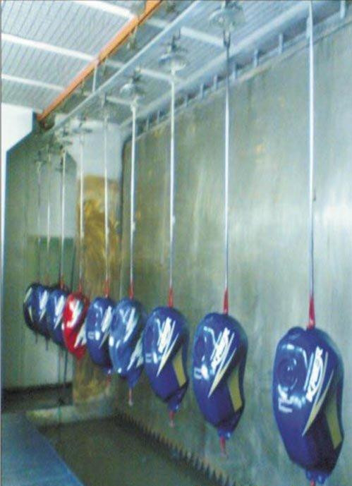 汽车油盖箱机器人涂装生产线采用积放输送链输送线,将油盖箱输送到每一道工序上。