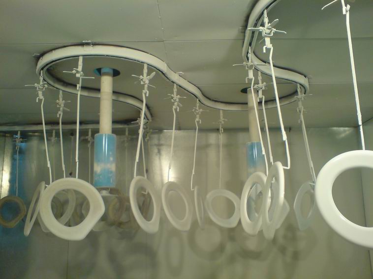 塑胶马桶盖DISK静电喷涂设备由人工上下工件区、工件输送线、除尘系统、Ω型喷漆室、旋碟静电喷枪系统、上下往复机系统、供漆系统、洁净鲜风供给系统、废气排放系统、烘干炉、加热系统、冷却系统组成。