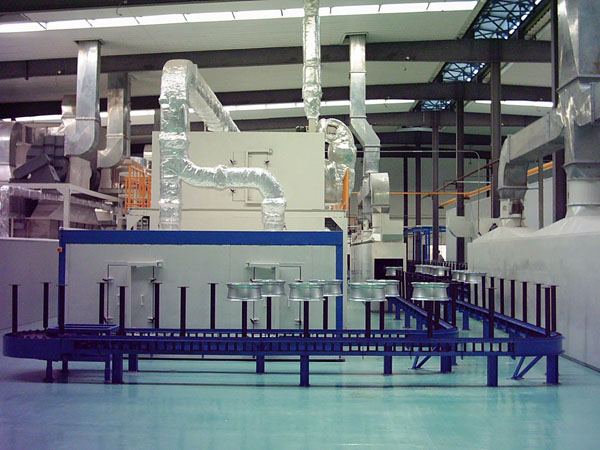 小轿车轮毂涂装生产线由人工上下工件区、工件输送线、除尘系统、预热系统、喷漆室、自动机器人、供漆系统、洁净鲜风供给系统、废气排放系统、烘干炉、加热系统、冷却系统组成。